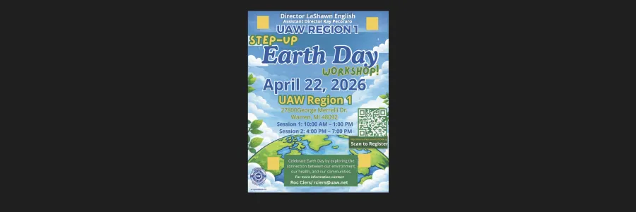 Join UAW Region 1 members on April 22, 2026, in Warren, Michigan, for an interactive Earth Day Workshop exploring the connection between our environment, health, and communities.